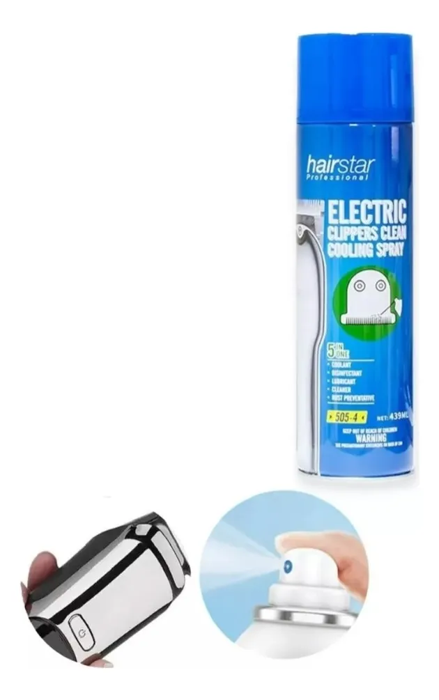 Spray Cooling Clippers Electric 5 In One Hairstar 439 ml es un producto diseñado para proporcionar enfriamiento instantáneo a las máquinas de corte y tijeras eléctricas. Ayuda a mantener la temperatura adecuada durante el uso prolongado, evitando el sobrecalentamiento y mejorando el rendimiento de los aparatos. Beneficios: • Enfría rápidamente las herramientas de corte y afeitado. • Prolonga la vida útil de las máquinas eléctricas. • Previene daños por calor en cuchillas y motores. • Mejora la comodidad del usuario durante cortes prolongados. Modo de uso: 1. Agitar bien antes de usar. 2. Pulverizar directamente sobre las cuchillas o partes eléctricas calientes de la máquina. 3. Mantener una distancia de 15 a 20 cm para un enfriamiento uniforme. 4. Repetir según sea necesario durante su uso.