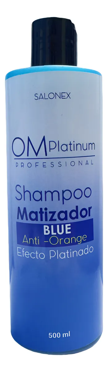 Shampoo De Matizador Azul OM Salonex 450ml – AZUL: Especial para cabellos con visos, ideal para bajar el naranjo del cabello decolorado. **INSTRUCCIONES DE USO** – Mezclar el matizador con acondicionador, aplicar en el cabello húmedo, la primera aplicación dejar actuar de 30 segundos a 1 minuto, según el resultado puede extender este tiempo al que usted desee, y luego enjuagar. – Usted elige el color al que desea llegar, el cual va a depender de la cantidad de tiempo de exposición del producto. – Se recomienda aplicarlo cada 4 o 5 lavados.