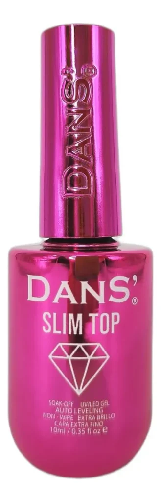 Top Coat Slim Dans 10 ml Características: – Formato: 10ml, ideal para uso profesional y doméstico. – Textura ultrafina: Se aplica de manera uniforme y ligera sobre el esmalte. – Extra brillo: Proporciona un acabado brillante y luminoso que dura más tiempo. – Protección de uñas: Ayuda a prevenir desgaste y descamado del esmalte. – Versátil: Perfecto para manicura y pedicura, compatible con todo tipo de esmaltes. – Acabado profesional: Deja un look suave, uniforme y duradero tipo salón de belleza.